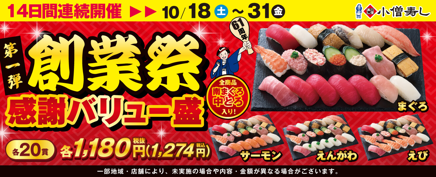 2025年10月18日(土)~小僧寿し【創業祭】第1弾!感謝バリュー盛フェア!(店舗により未実施の場合がございます)