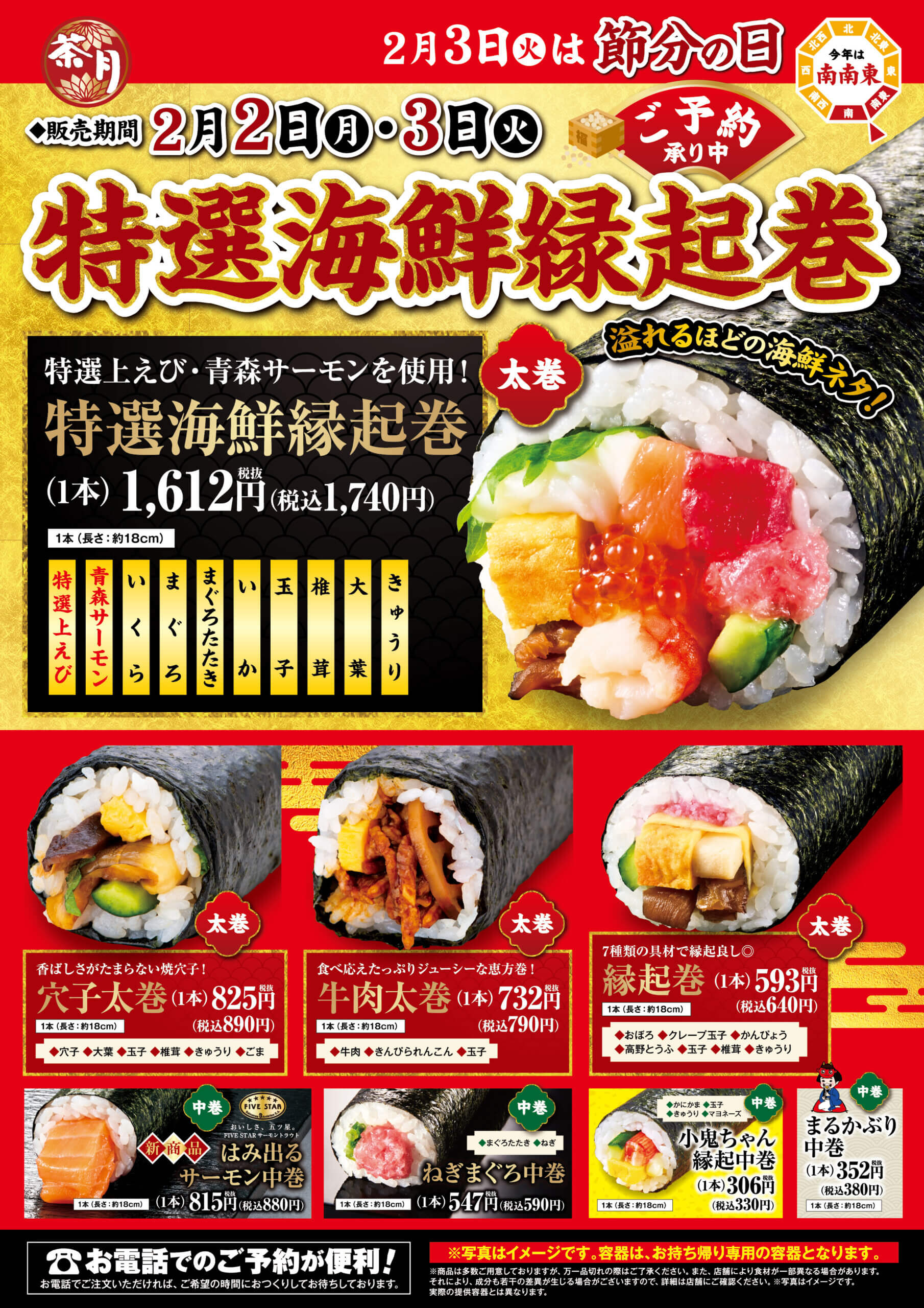 小僧寿しでは、 『特選海鮮縁起巻』『元祖小僧縁起巻』『穴子太巻』など バラエティ豊かな『縁起巻』(恵方巻)をご用意しております!