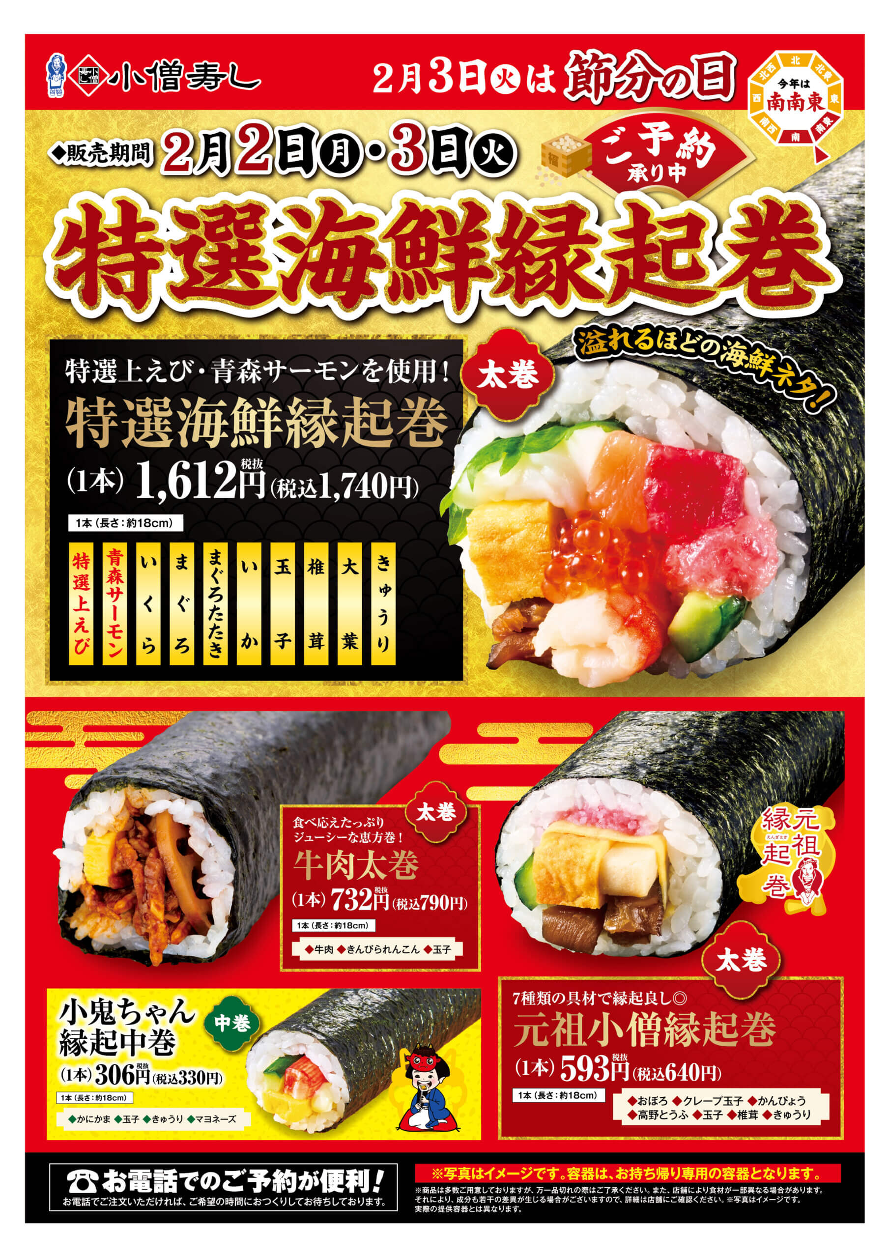 【ご予約承り中】◆◇◆節分・縁起巻◆◇◆ 鬼は~外!福は~うち!2月3日は【節分】! 笑う門には福来たる!食べれば誰もが笑顔になる!小僧寿しの【縁起巻】! 小僧寿しでは、 『特選海鮮縁起巻』『元祖小僧縁起巻』『牛肉太巻』など バラエティ豊かな『縁起巻』(恵方巻)をご用意しております! “福”を巻き込むよう、真心こめて一本一本【店内製造】しております。 この機会にぜひ、ご来店ください。